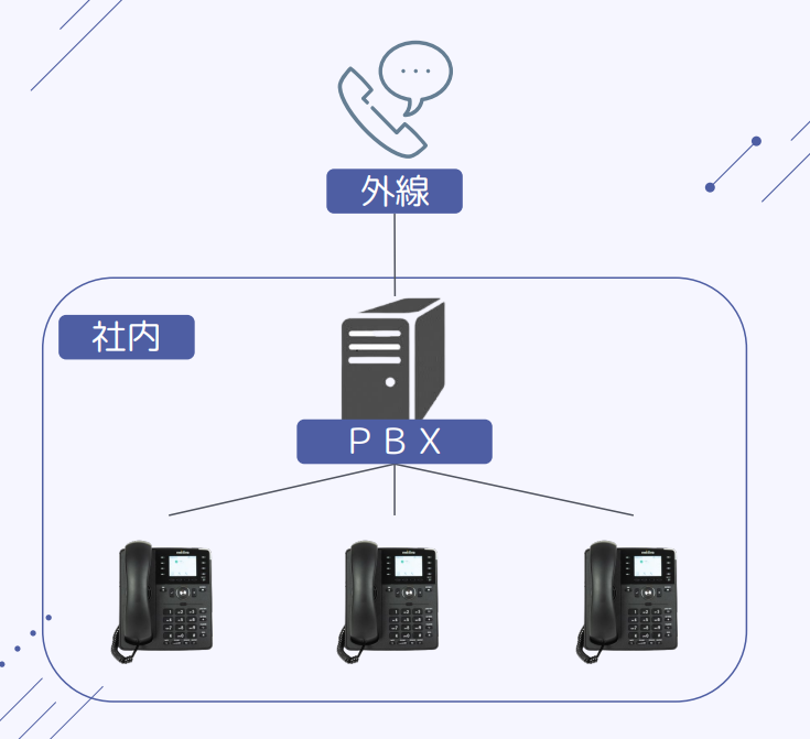 従来は、オフィス内に専用のPBX機器を設置し、物理的な回線や電話機と接続して利用していました。