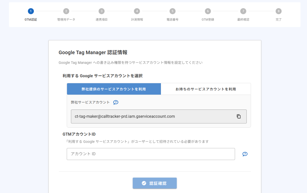 まず、Google Tag Managerと連携するための認証情報を入力します。