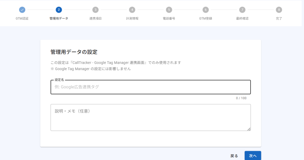 この名前は「CallTracker – Google Tag Manager 連携画面」でのみ使用されるため、プロジェクト名やサイト名など、分かりやすい名前を付けておくと管理しやすくなります。