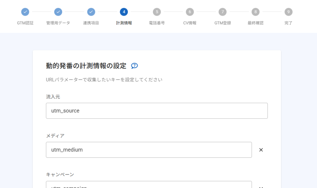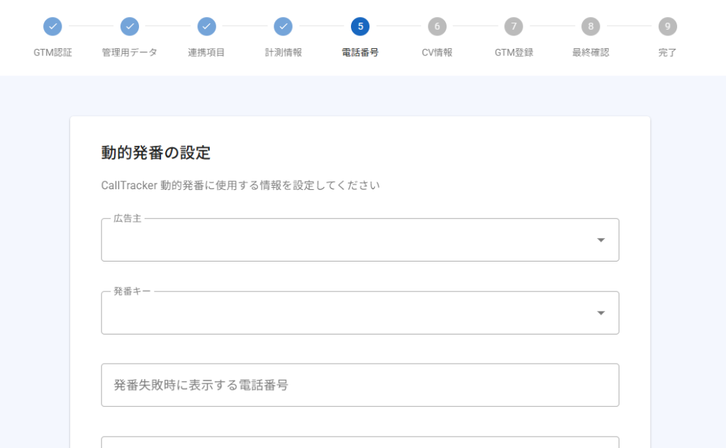 Googleタグマネージャー連携ツールでは、設定画面に沿って必要な情報を入力していくだけで、電話計測のタグを作成することができます。